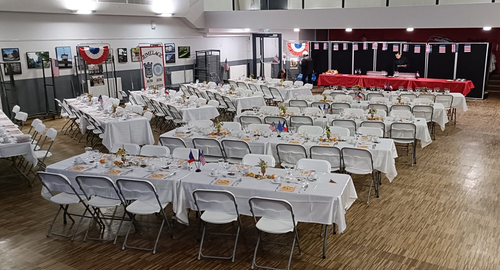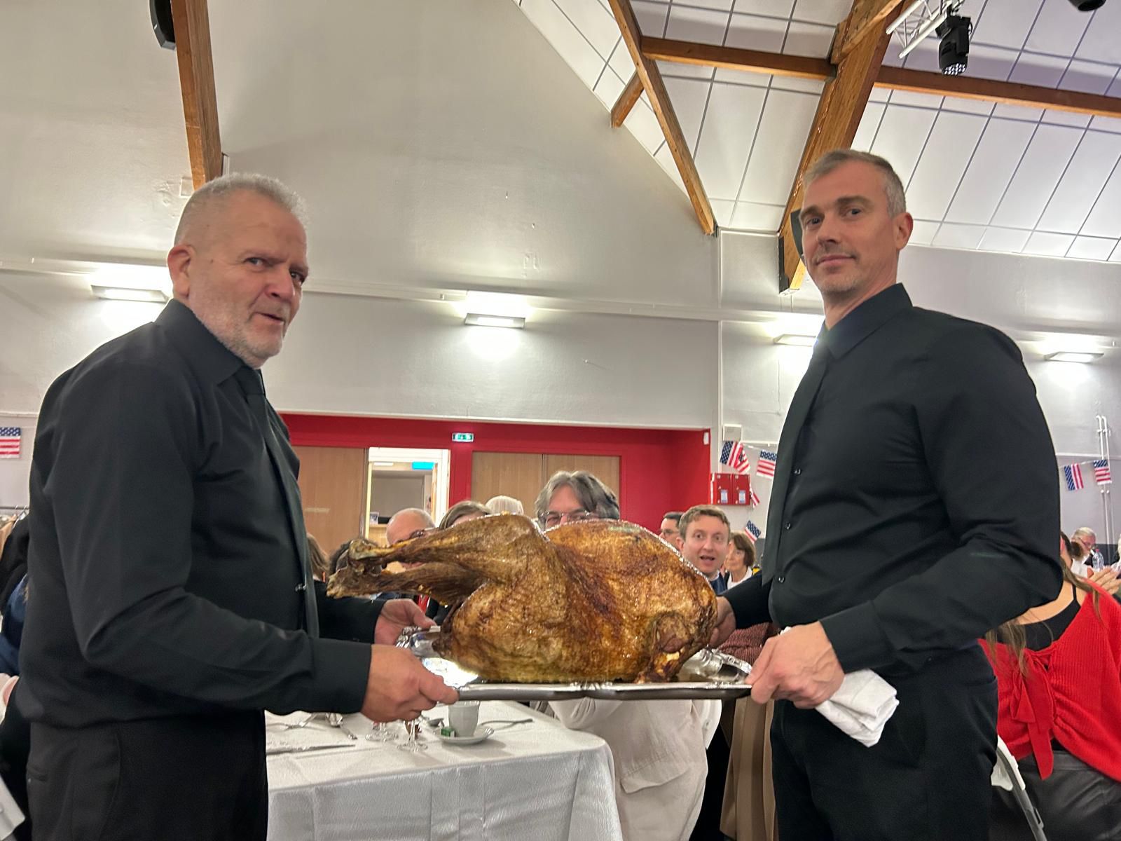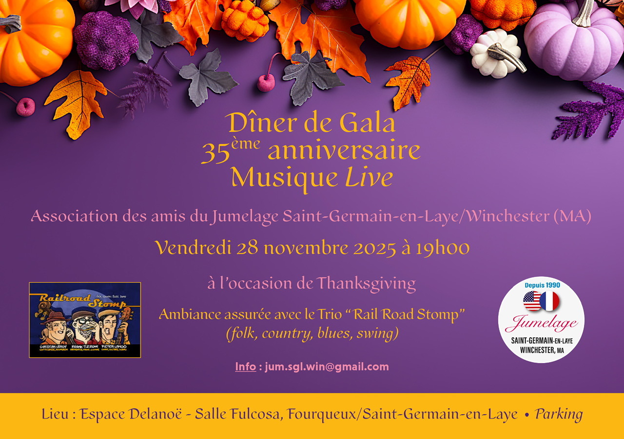 Ce vendredi 28 novembre 2025, à l'occasion de Thanksgiving, était organisé le Dîner de Gala du 35è anniversaire de notre Jumelage. Pour cette grande occasion, plus de 120 convives étaient réunis dans la salle Fulcosa de l'Espace Delanoë à Fourqueux, gracieusement mise à notre disposition par la ville.